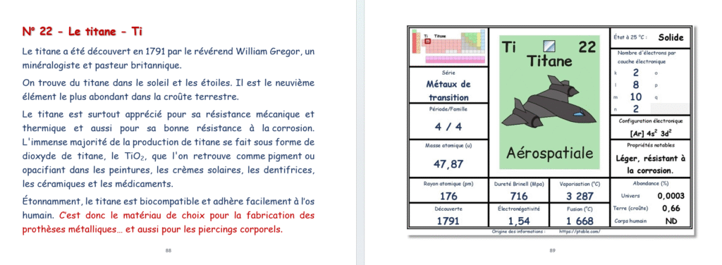 Ce livre vous présente un aperçu de ces 118 éléments en affichant pour chaque élément un tableau de ses principales caractéristiques suivi généralement de l’historique de sa découverte et d’un aperçu de ses principaux usages actuels.